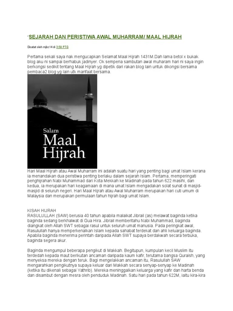 Sejarah Maal Hijrah / Salam Maal Hijrah 1432 Bersamaan 7 Disember 2010 Zikri Husaini. Awal muharram atau maal hijrah merupakan hari penting bagi umat islam kerana menandakan peristiwa penting yang berlaku dalam sejarah islam . Dimulai dari hari dan bulan rasulullah melakukan hijrah dari mekah ke madinah. Ia amat penting kerana berlakunya peristiwa sejarah islam iaitu memperingati penghijrahan nabi muhammad saw dari · kota makkah ke .